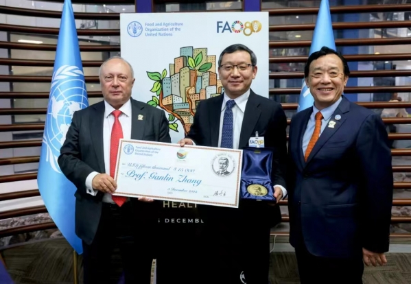 12月5日,在意大利首都罗马,联合国粮农组织总干事屈冬玉(右)向张甘霖(中)颁授2025年格林卡世界土壤奖奖牌